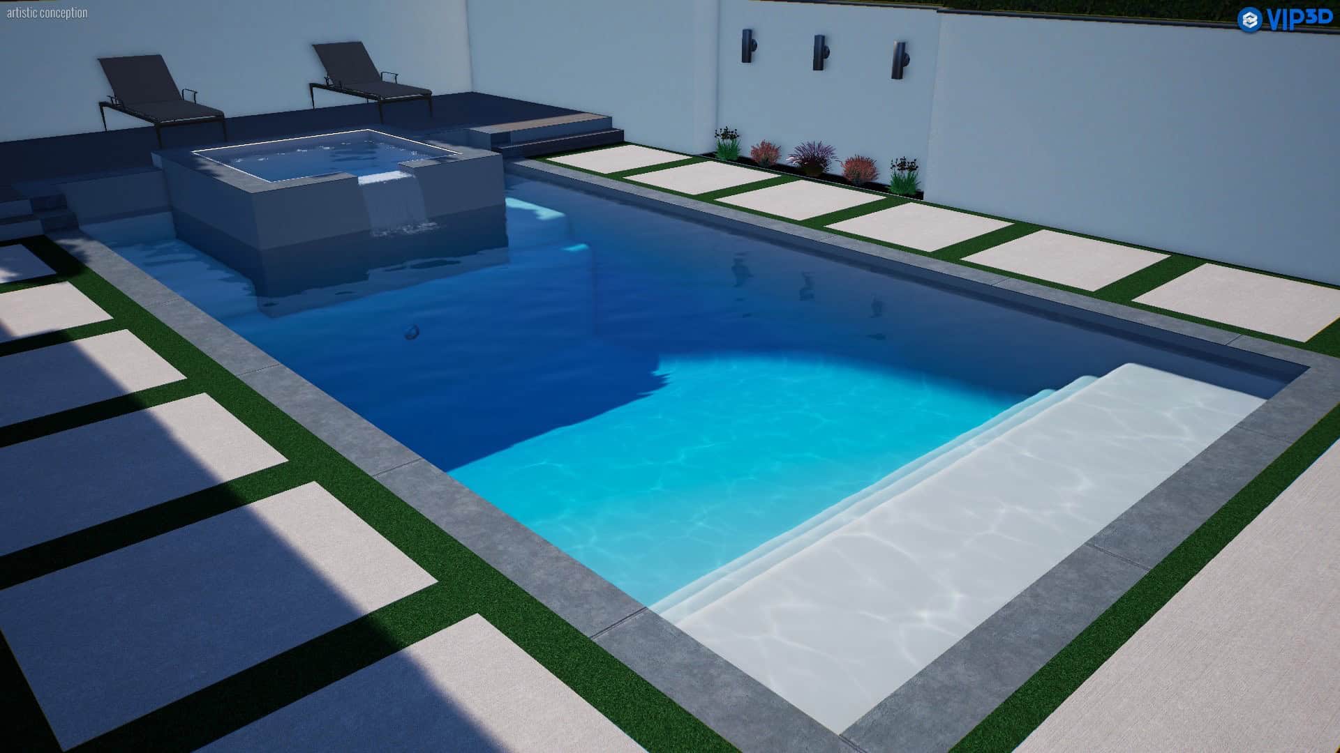 The remodeled pool now features durable and stylish concrete slabs and artificial turf, travertine deck, and a state-of-the-art automated control system for enhanced convenience and efficiency.